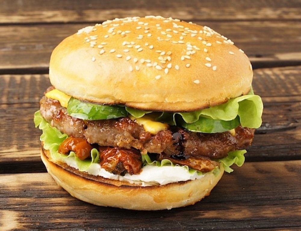 Сочная говяжья котлета, сыр «Креметте», вяленые томаты, сыр «Чеддер», свежий огурец, лист салата, бальзамический крем.