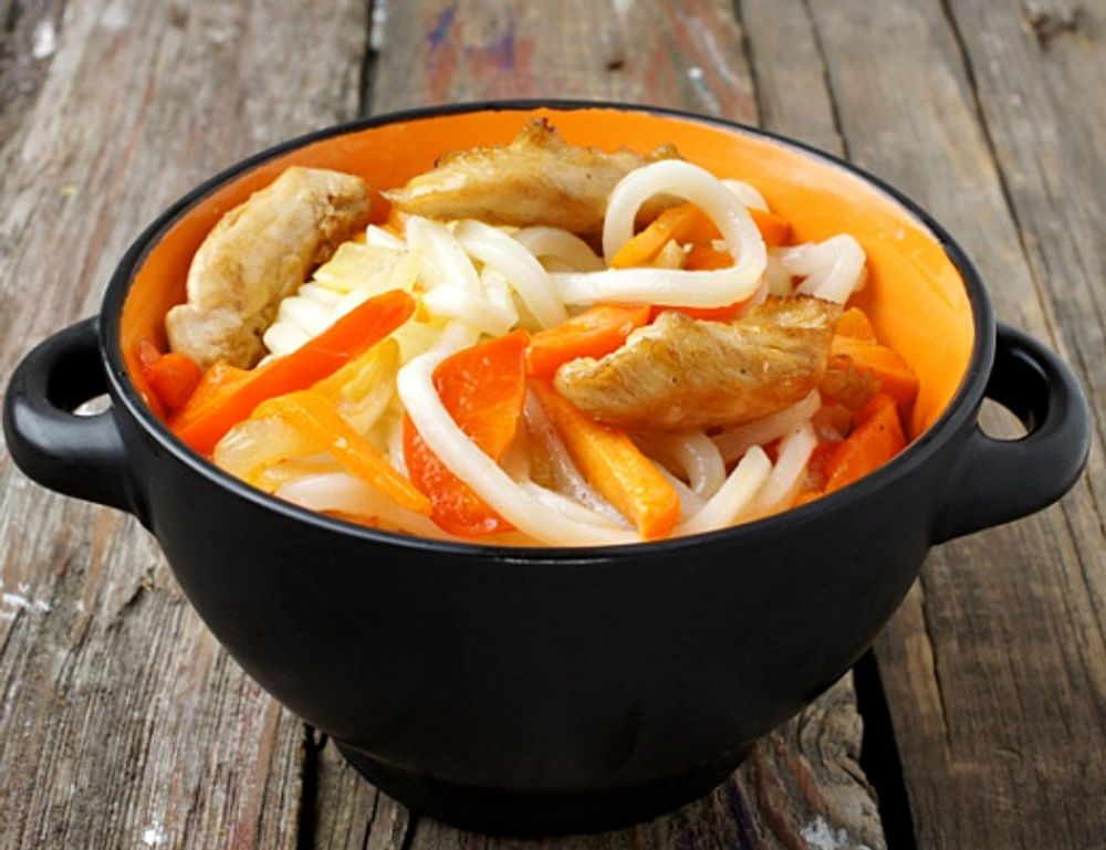 Лапша, овощи в Кисло - сладком соусе и имбирно - чесночной заправке. Мясо на выбор: курочка или свинина.