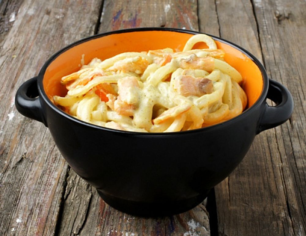 Лапша, филе красной рыбы, овощи в сливочном соусе в имбирно - чесночной заправке и с индийскими специями.