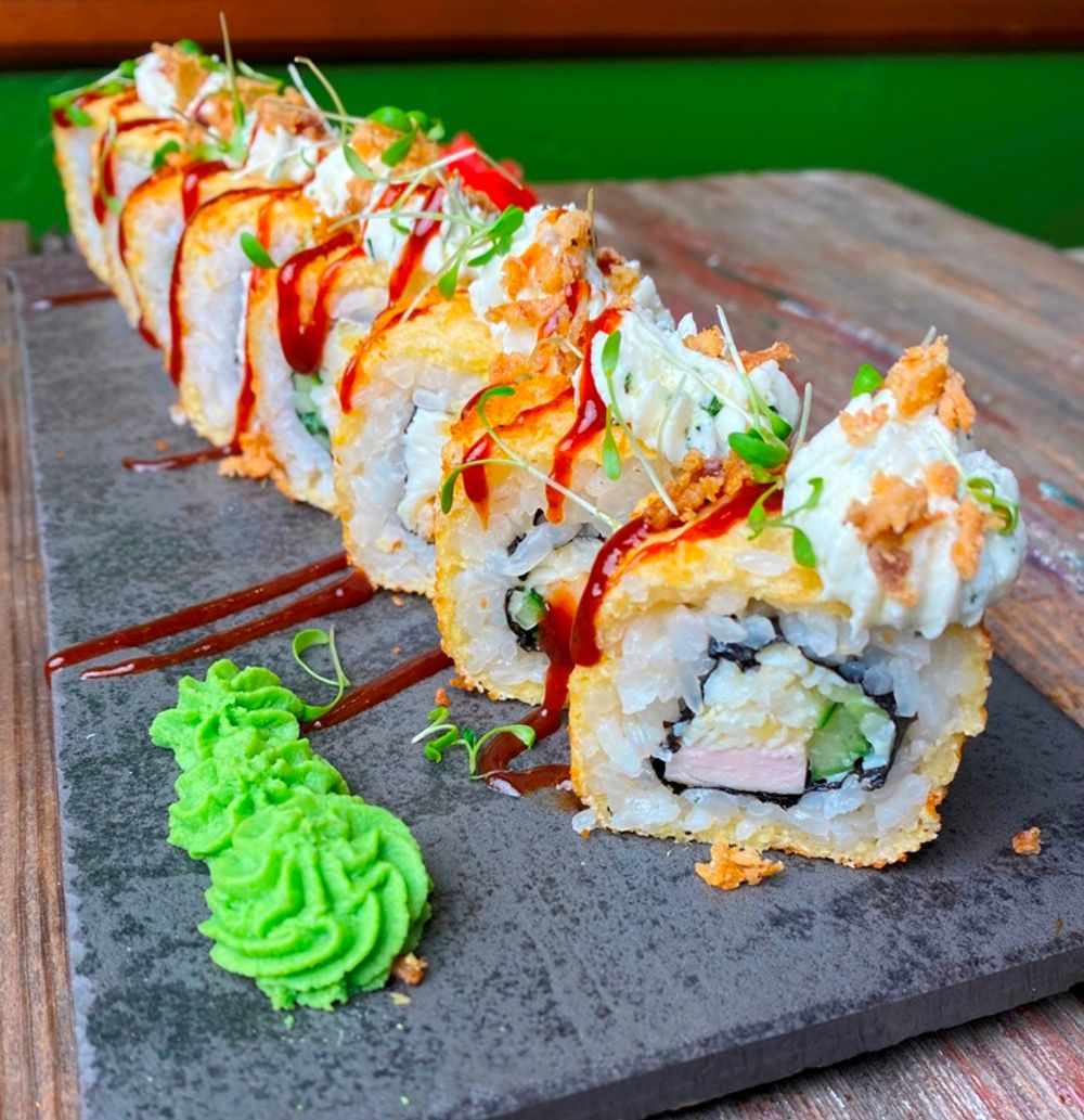Курочка жареная, сыр, огурец, лук Криспи, сухари Панко, соусы: чесночный и BBQ. Ролл в кляре, обжаренный в масле.