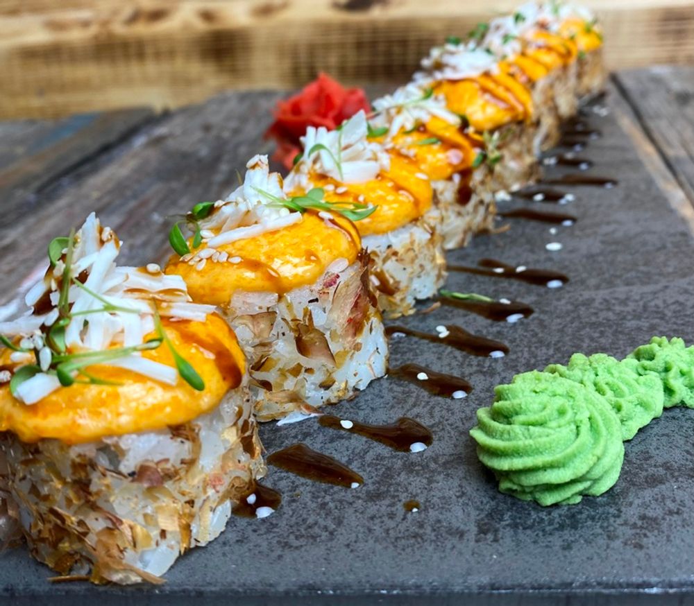 Снежный краб, сыр сливочный, огурец, соус из икры Масаго и сыра, кунжут, соус Унаги и стружка тунца.
