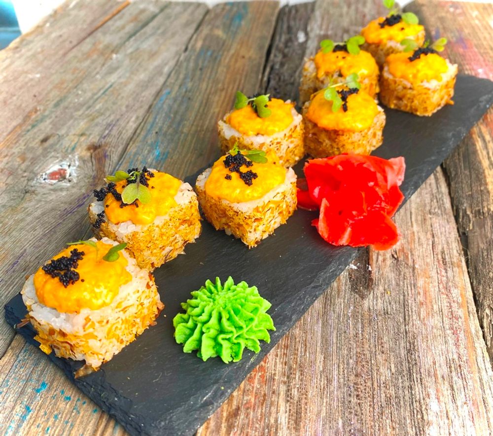 Сливочный сыр, лосось, огурец, икра Масаго, стружка тунца, под соусом из сыра и икры Масаго и соусом Спайси.