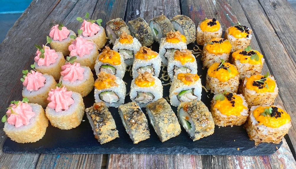 Ролл запеченный с курицей, Ролл запеченный с лососем, Лава темпура лосось, Кани темпура.