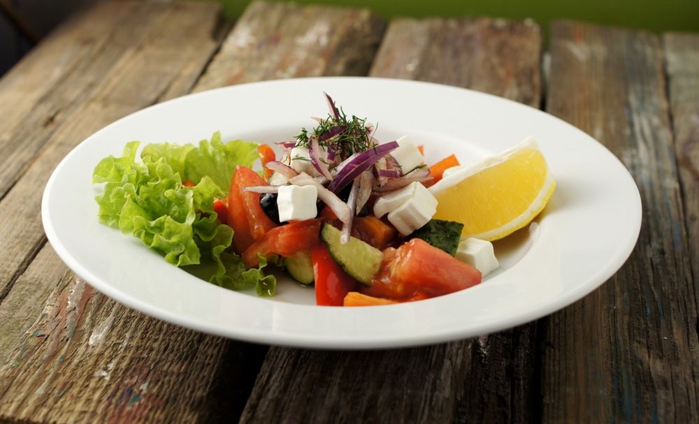 Свежие огурцы, помидоры, перец сладкий, сыр «Фета», заправка
