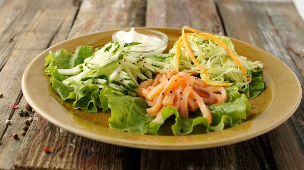 Нежная копчёная семга со свежими огурчиками и салатом из капусты