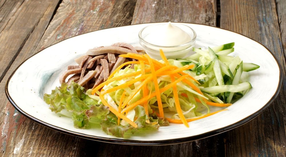 Говяжий язык со свежим огурчиком, сочной капустой и чесночным соусом