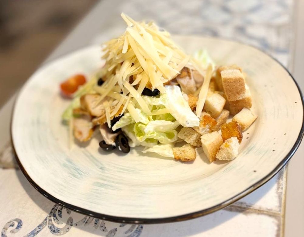 Пекинская капуста с курицей, чесночными сухариками, нежной заправкой и сыром «Пармезан»