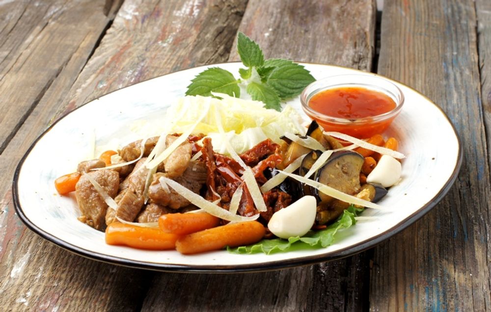 Свинина обжаренная с овощами, пекинская капуста, сыр "Пармезан"