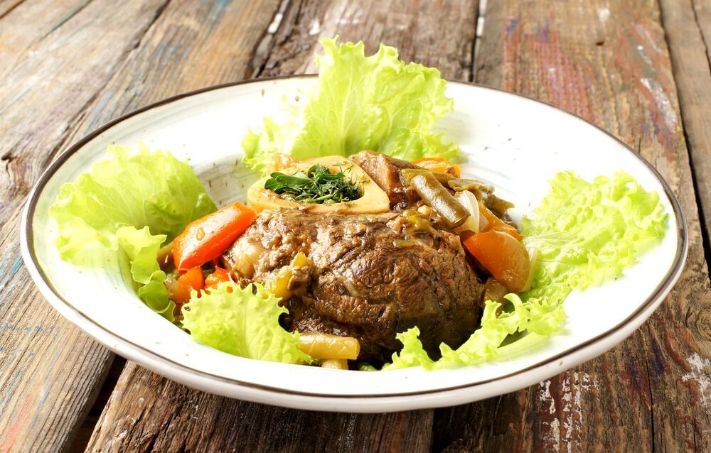 Стейк по итальянски - томленая телячья голень с овощами