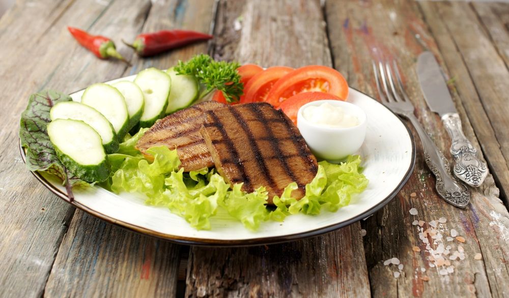 Язык жареный на гриле, подается со свежими огурцами и помидорами