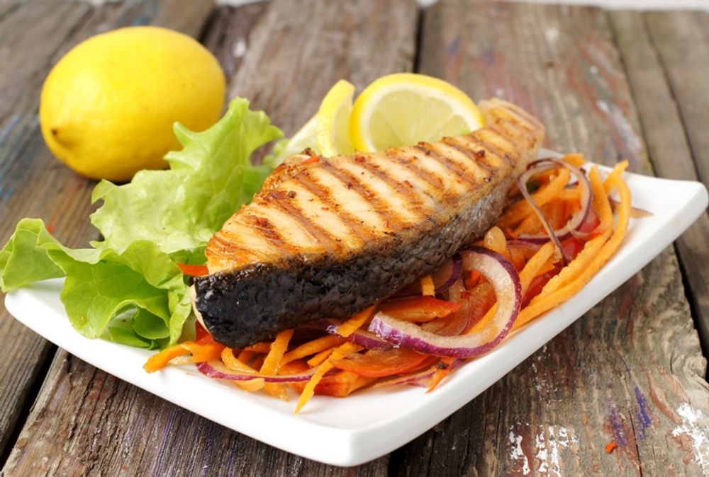 Семга-гриль со свежими овощами, заправленными соусом "Бальзамико".