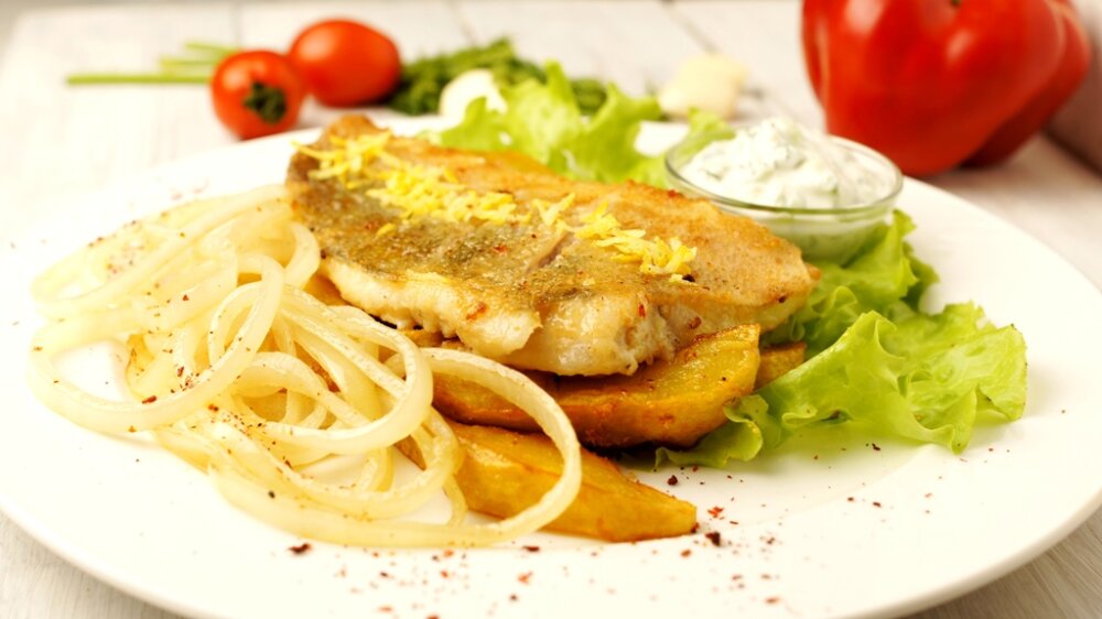Филе судака, луковые кольца и картофельные дольки с греческим соусом «Дзадзыки»
