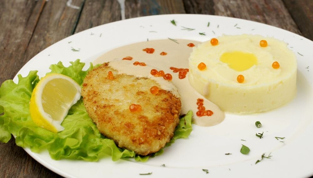 Подаётся в икорно-сливочном соусе с картофельным пюре.