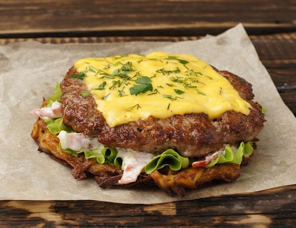 Сочная говяжья котлета, картофельный драник, сыр «Чеддер», овощной салат со сметаной, лист салата.