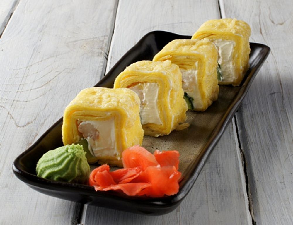 Мексиканская лепешка, сливочный сыр, креветка в темпуре, огурец, кунжут. Ролл в кляре, обжаренный на масле.