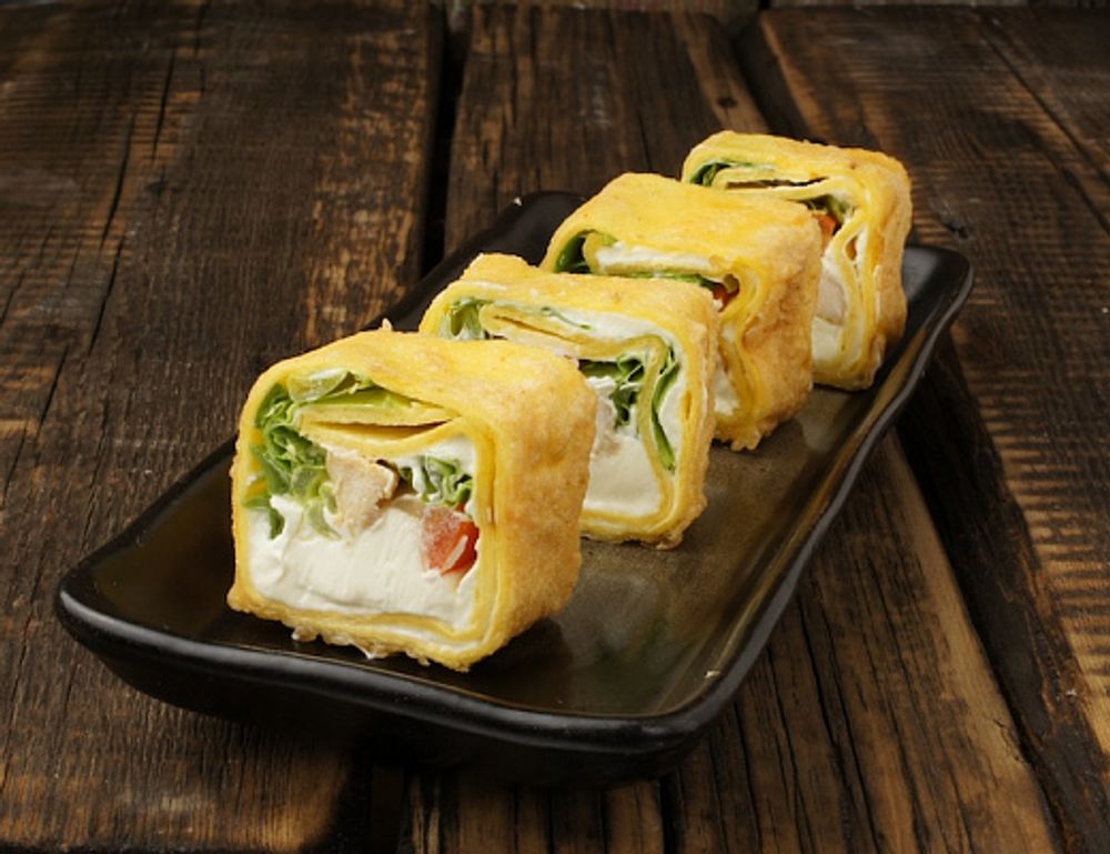 Мексиканская лепешка, сливочный сыр, жареная курочка, салат, помидор, соус Ким-Чи. Ролл в кляре, обжаренный в масле.