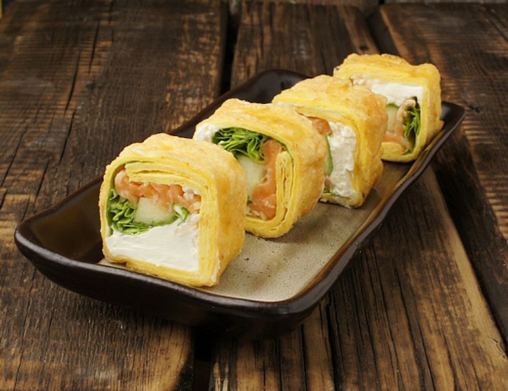 Мексиканская лепешка, сливочный сыр, жаренное филе красной рыбы, салат, огурец, кунжут. Ролл в кляре, обжаренный на масле.