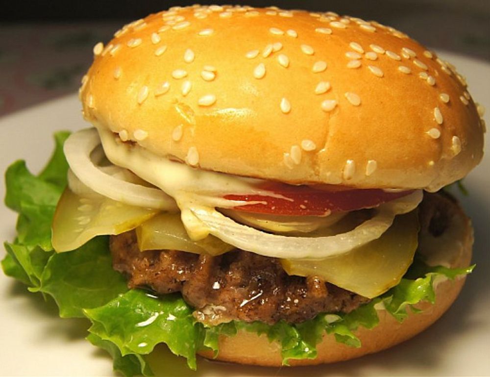 Cочная говяжья котлета, сыр Чеддер, томаты свежие, маринованные огурцы, лук кольцами, лист салата, фирменный соус.
