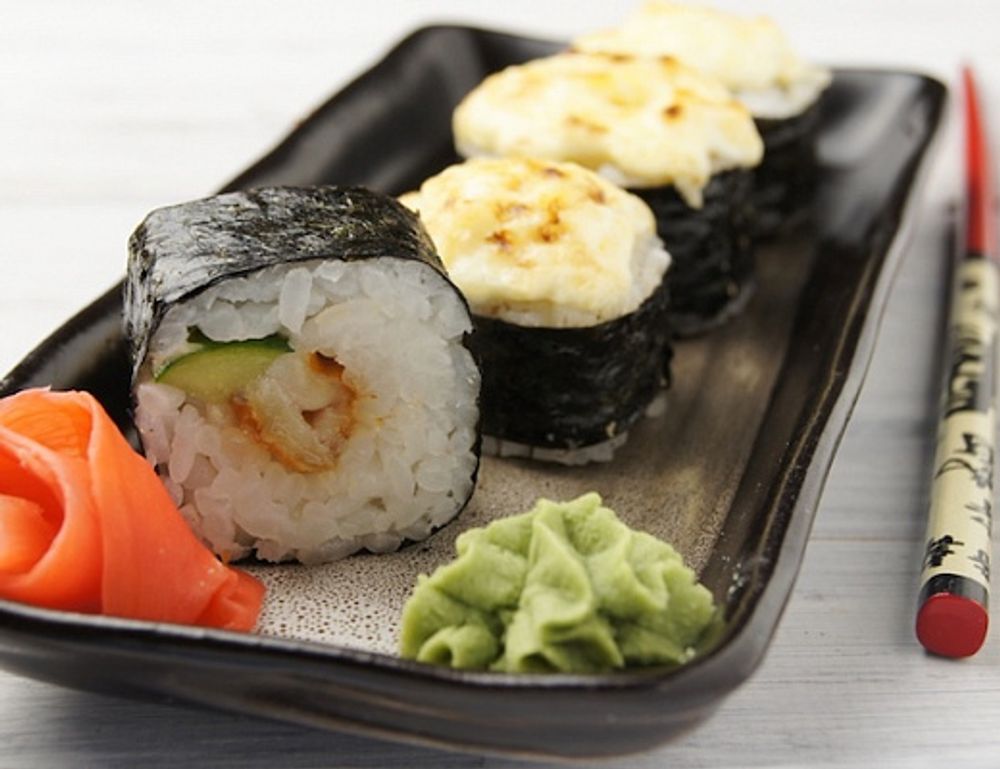 Запечённый ролл под сырным соусом: с креветкой в темпуре в Унаги соусе и свежим огурчиком.