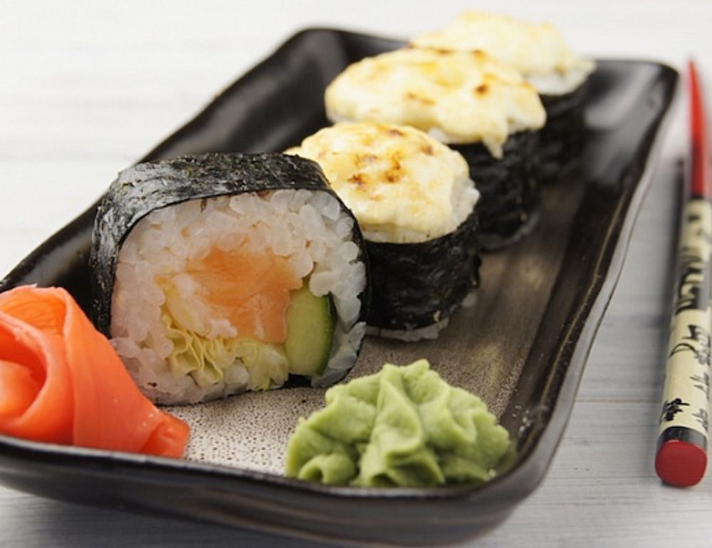 Запечённый ролл под сырным соусом: с жареным филе красной рыбы, листом салата и свежим огурцом.