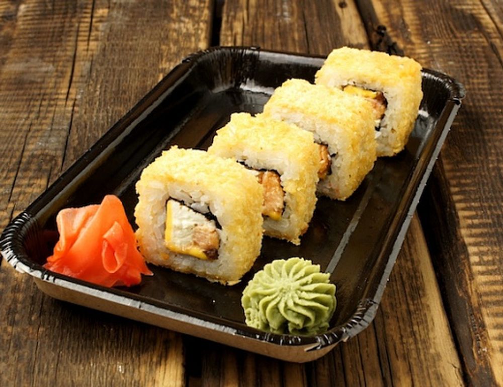 Обжаренный ролл в панировочных сухарях с лососем и с двумя видами сыра: Чеддер и Креммете.