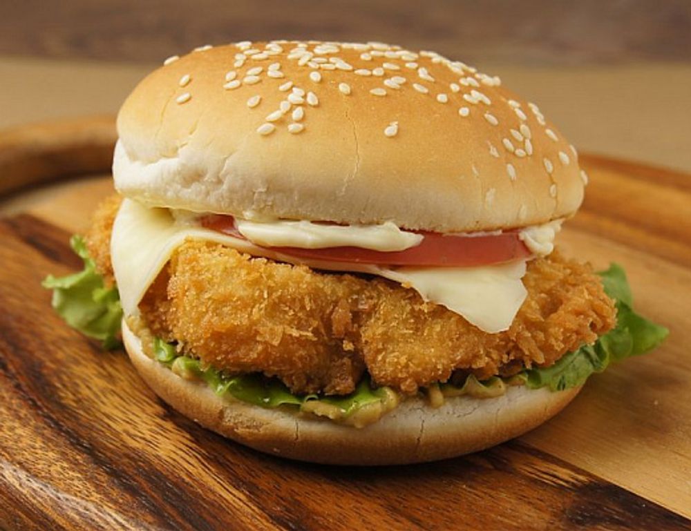 Нежное куриное филе в панировке, томаты свежие, лист салата, сыр Чеддер, фирменный соус и горчица.